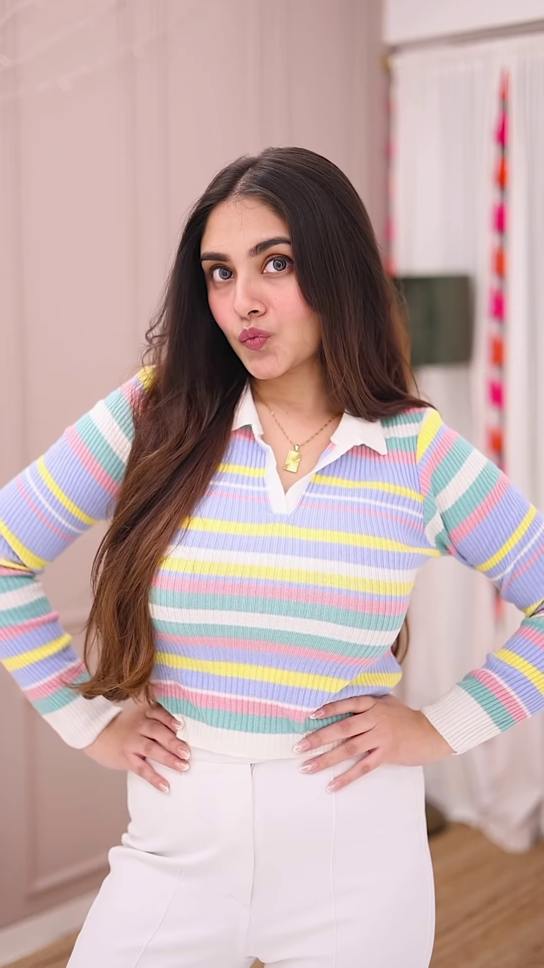 - π Striped Sweater: Horizontal pastel stripes in blue, yellow, pink, and green with white collar; paired with white pants and gold pendant