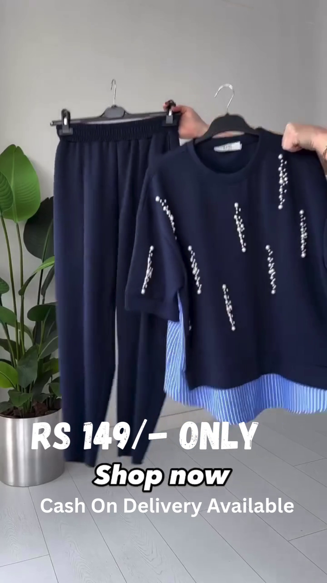 • Color & Aesthetic Appeal: The rich navy blue hue, complemented by delicate pearl details and a striped underlay, provides a striking contrast. This top effortlessly exudes class and refinement, perfect for both casual and semi-formal occasions.