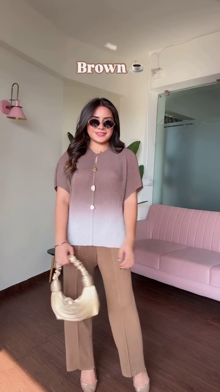 Paired with solid hot pink trousers, the outfit finds its power. The pants are high-waisted and tailored, elongating the legs and creating a sleek silhouette that balances the gradient top. The bold color makes a statement without needing embellishment—clean lines and confident hue do all the talking. The fabric is structured yet flexible, allowing for all-day wear without sacrificing style.
