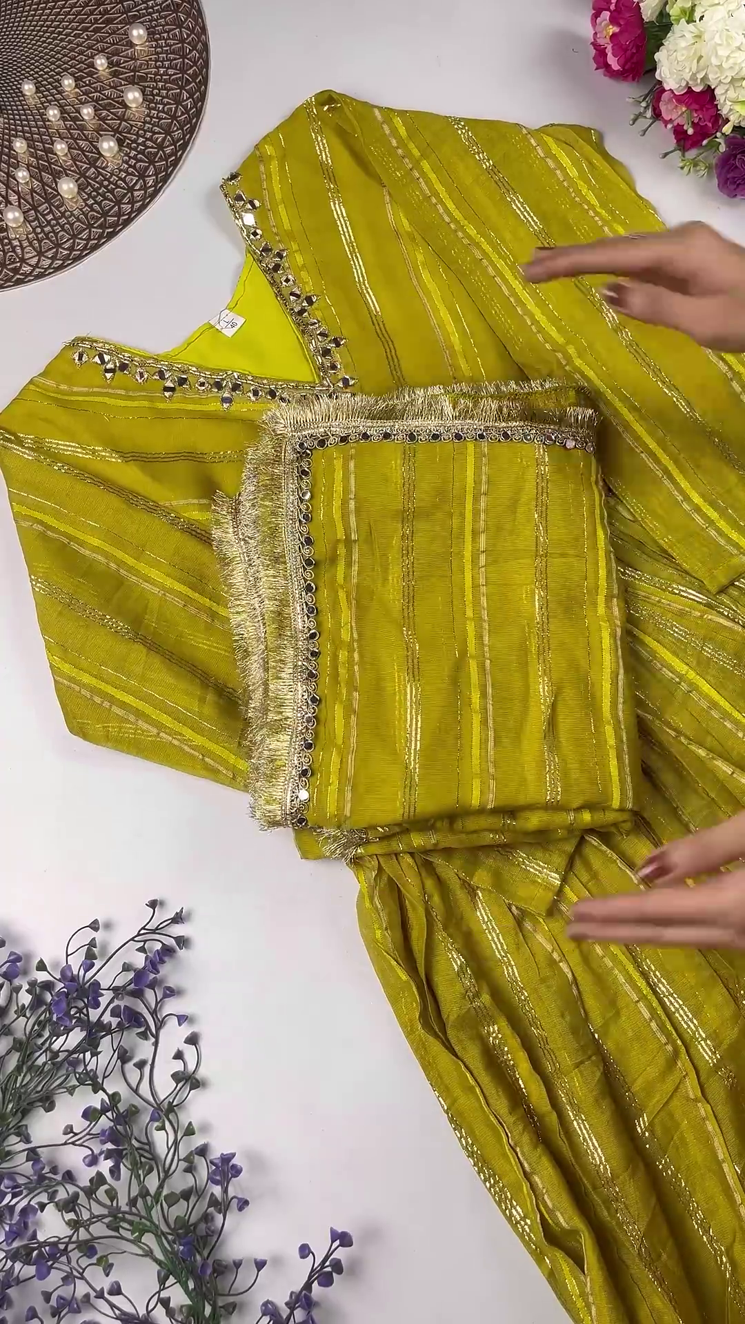 This gown set is an ideal choice for Sangeet nights, Wedding Receptions, and grand festive galas. The light-reflecting lurex stripes and mirror-work make this outfit exceptionally striking for evening events under professional lighting.