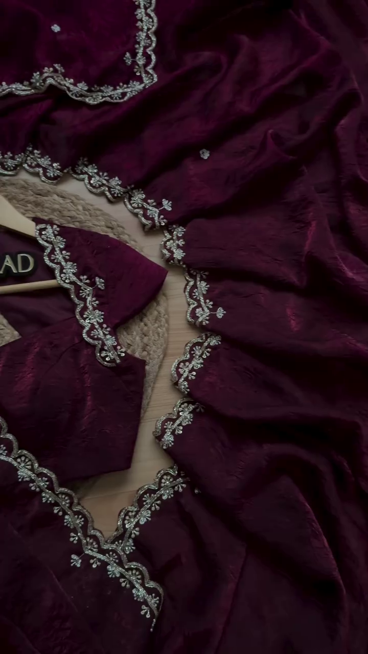 This maroon embroidered silk ensemble is not just a garment—it’s a story woven in thread and tradition. It invites the wearer to celebrate heritage with grace, to carry forward the legacy of craftsmanship, and to make every occasion feel like a moment of quiet grandeur.
