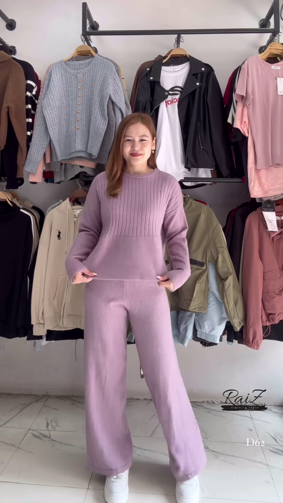 • 🟣 Light Purple: Soft pastel knit with relaxed sweater and matching pants + styled with gentle drape