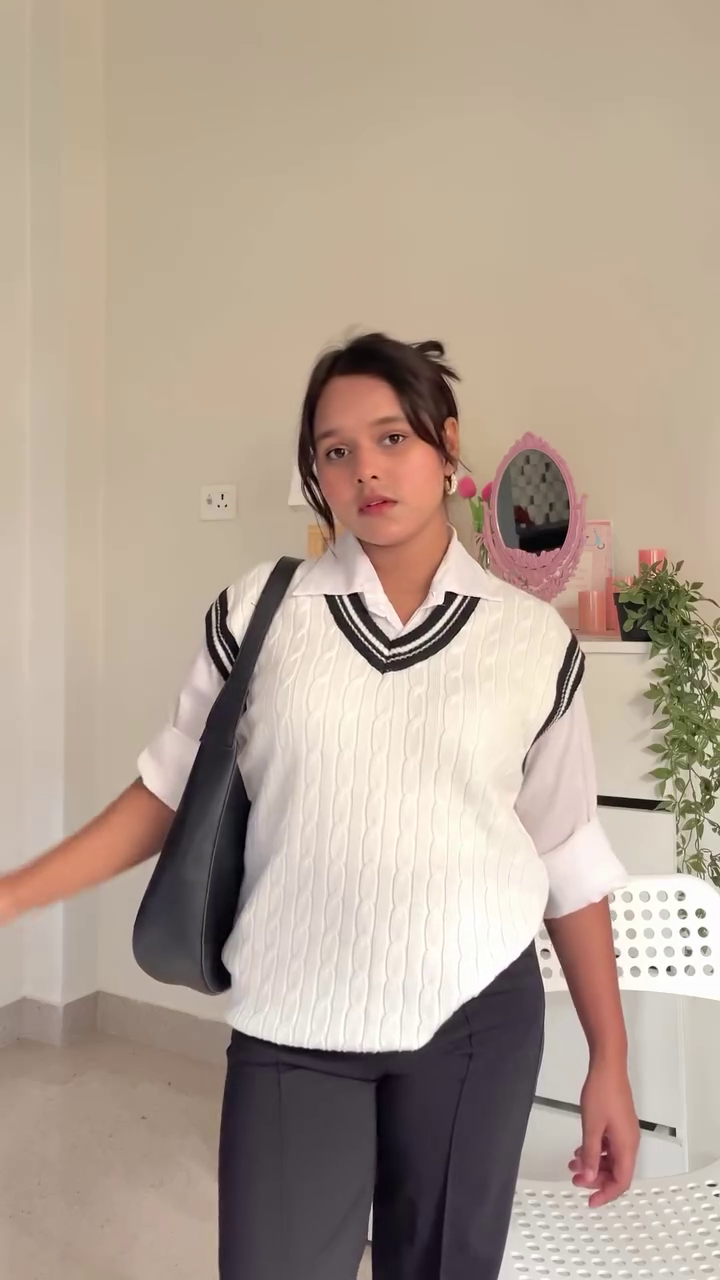 - 🤍 White Cable Vest: White cable-knit sweater vest layered over a collared shirt + black pants + black shoulder bag