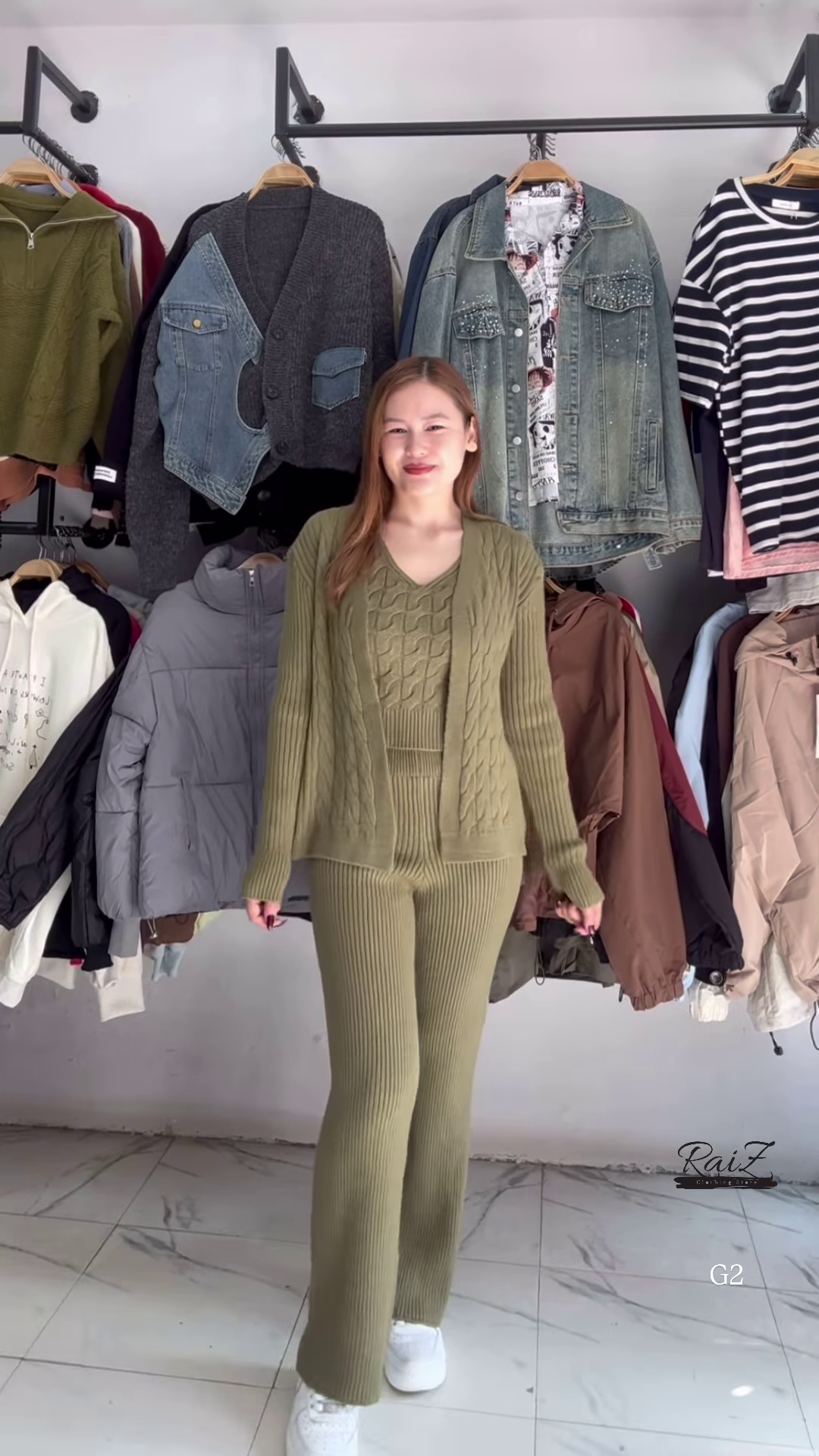 • 🔷 Light Blue: Ribbed knit cardigan + V-neck sweater + matching pants with cable detailing