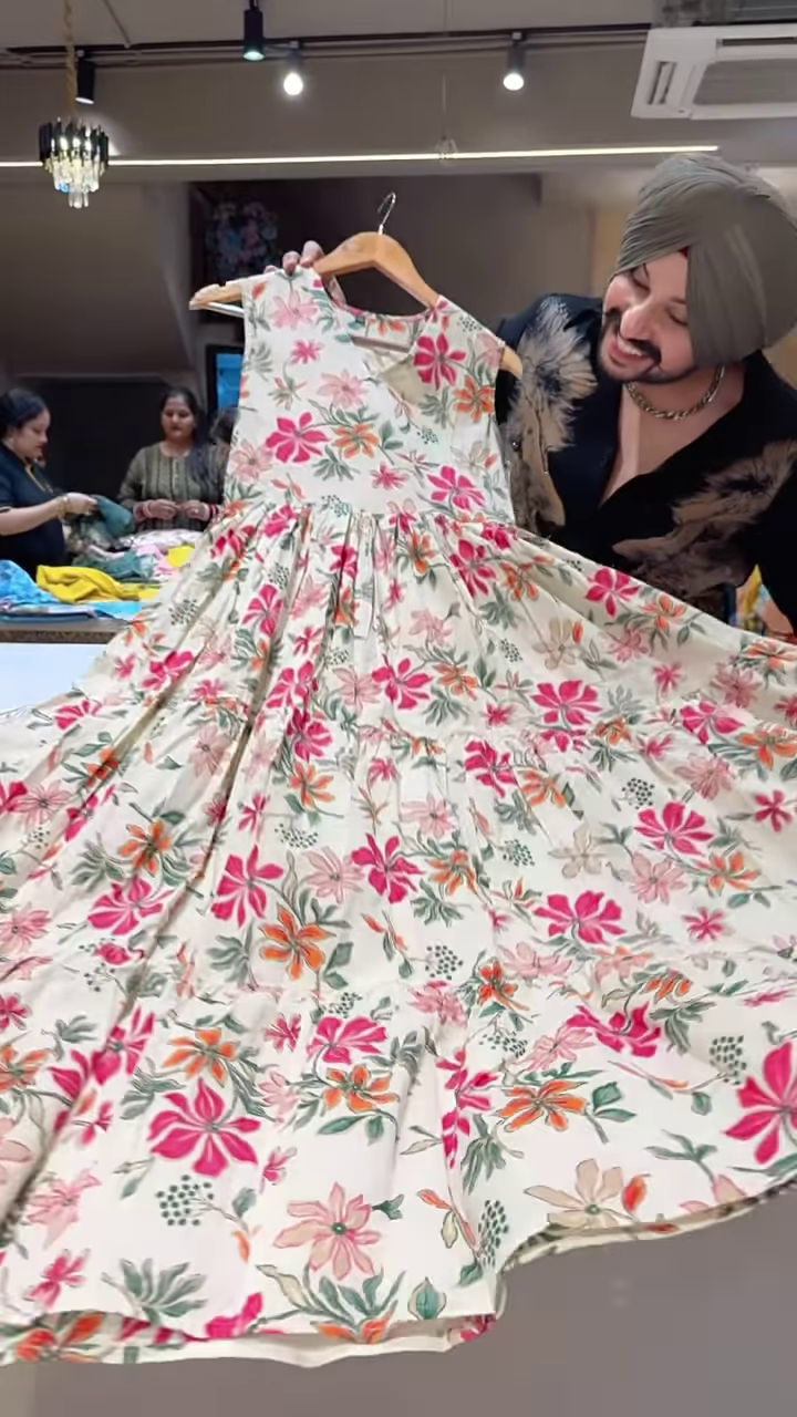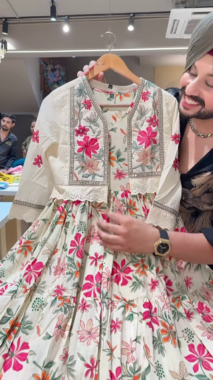 + Free ShippingMake a bold festive statement with this cream-colored Anarkali-style dress featuring multicolor floral embroidery and a voluminous flared hem. Crafted for ethnic fusion edits, boutique catalog features, or celebratory carousel drops, the ensemble blends traditional craftsmanship with striking color play and structured elegance.