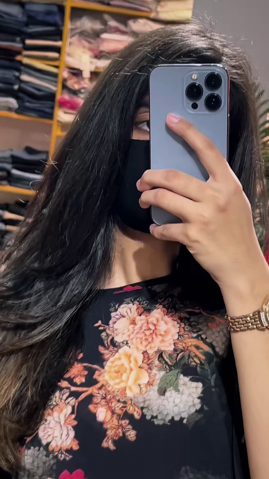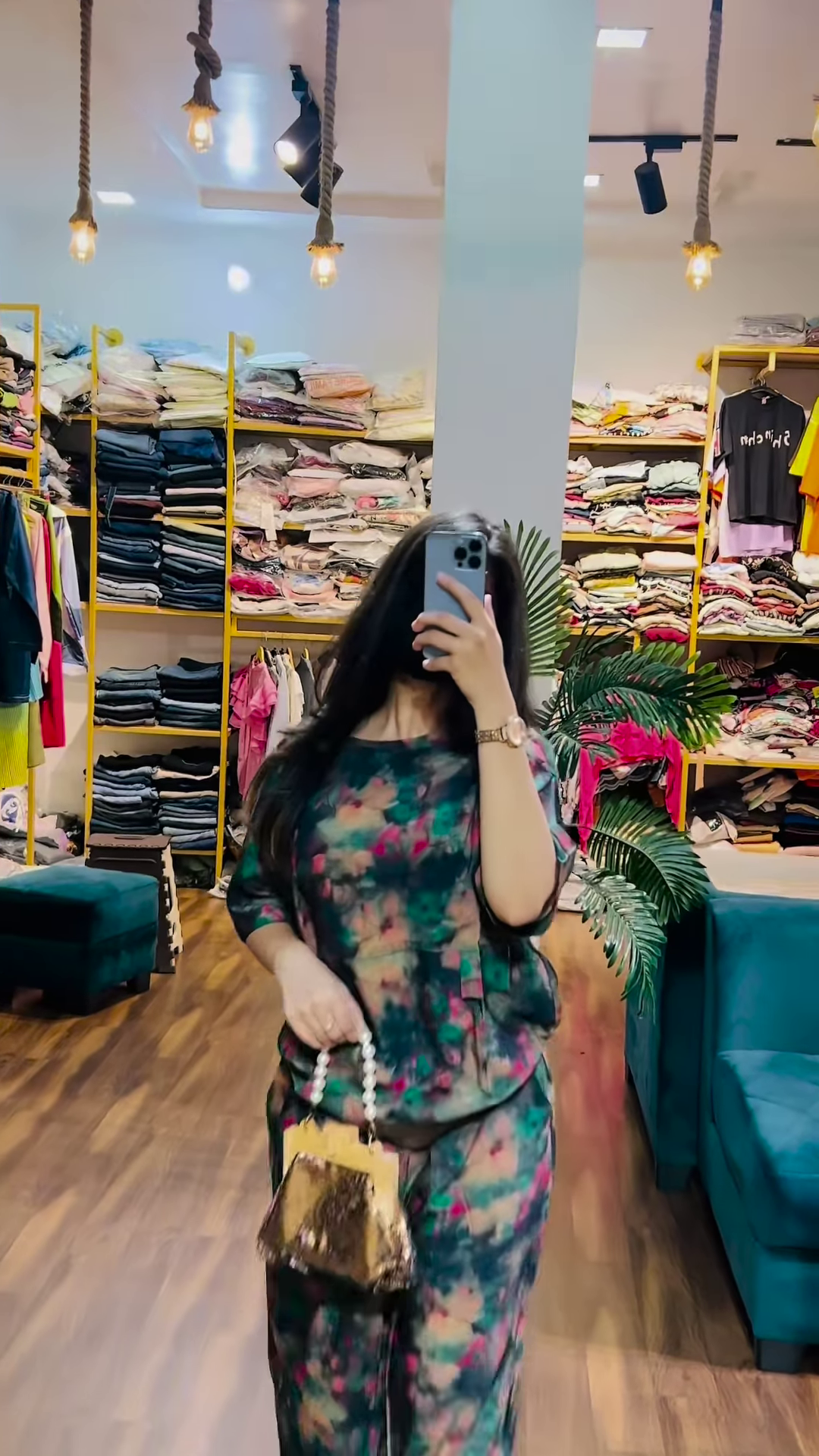 The backdrop—retail shelves lined with folded garments, a green sofa, and potted plants—evokes a curated and cozy shopping experience. The mirror pose emphasizes realism and relatability, tapping into the growing trend of user-generated fashion showcases and personalized retail storytelling. This setup helps customers visualize the garment in everyday moments rather than posed studio shots.