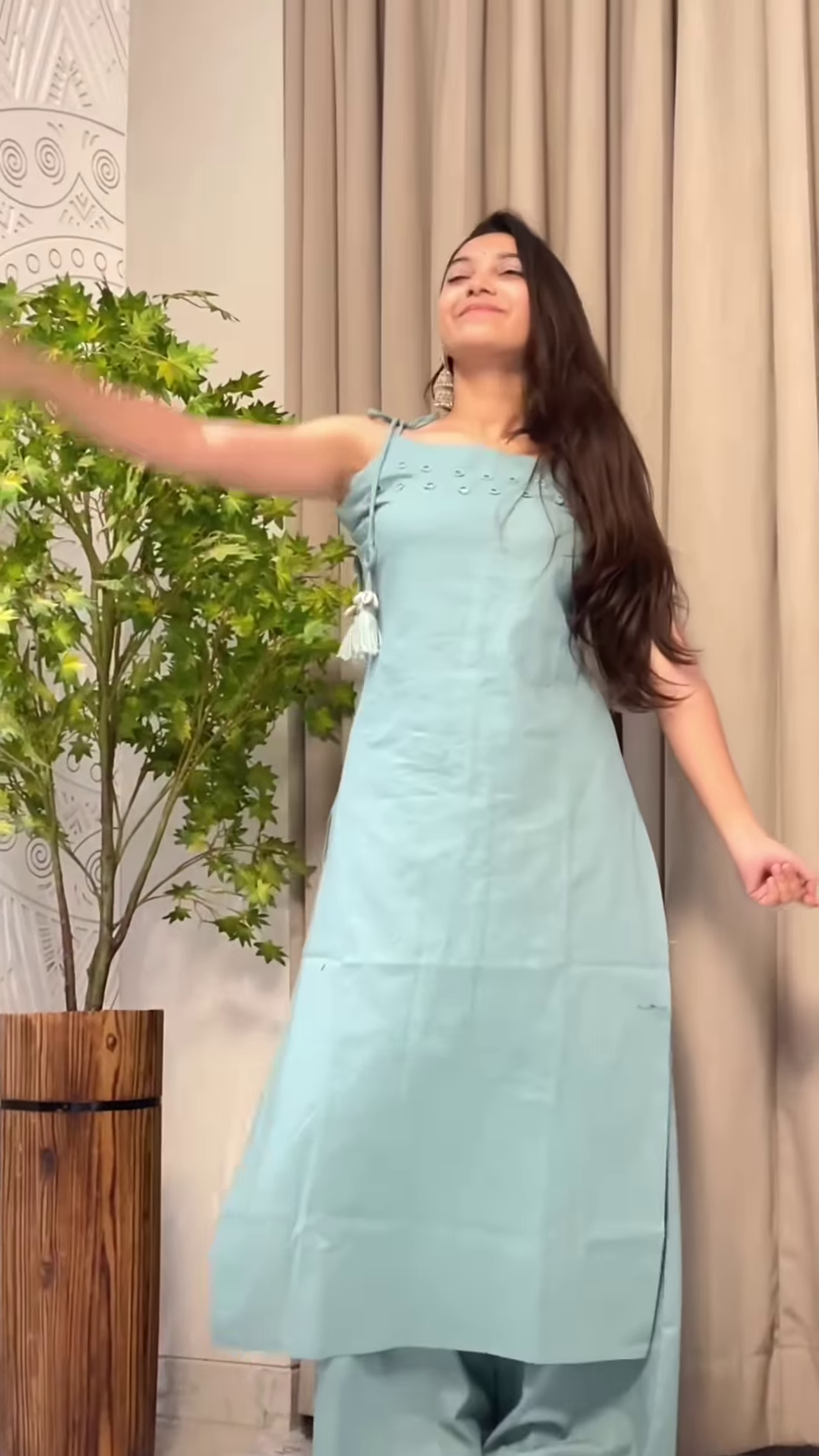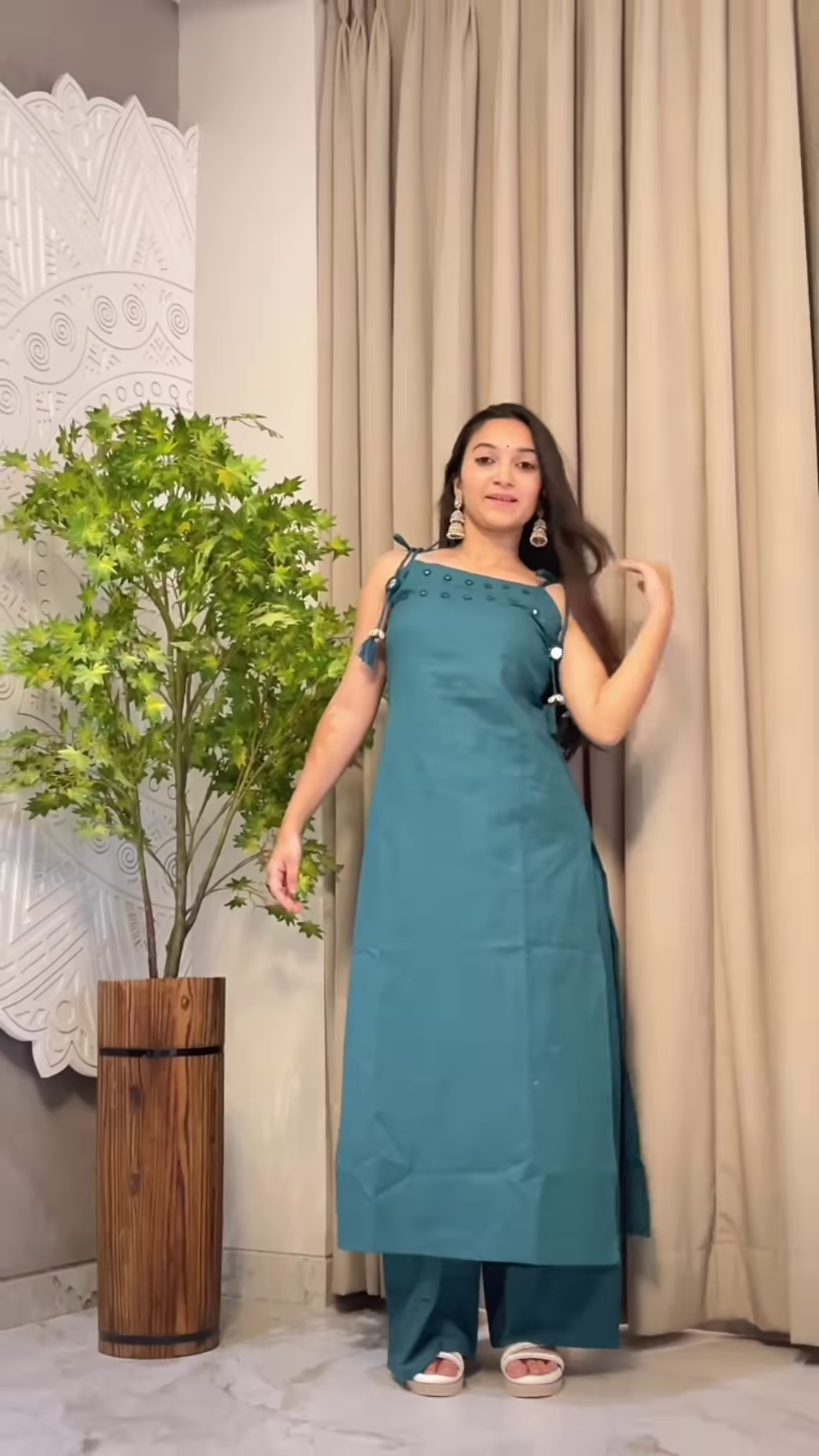 The model completes the look with white sandals and large ethnic earrings, subtly accentuating the outfit’s relaxed yet festive vibe. This styling is ideal for visual merchandising, lifestyle reels, or product listings aimed at audiences who appreciate modest silhouettes with a modern twist.